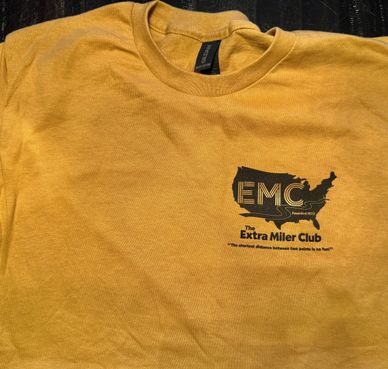The new style shirts are simple. They have the EMC logo as a heart patch on the front, with nothing on the back. In gold, they are available in small, medium, large and X-large. In light blue, they are available in medium, large, X-large and 2X-large. $8 + $5 shipping = $13.